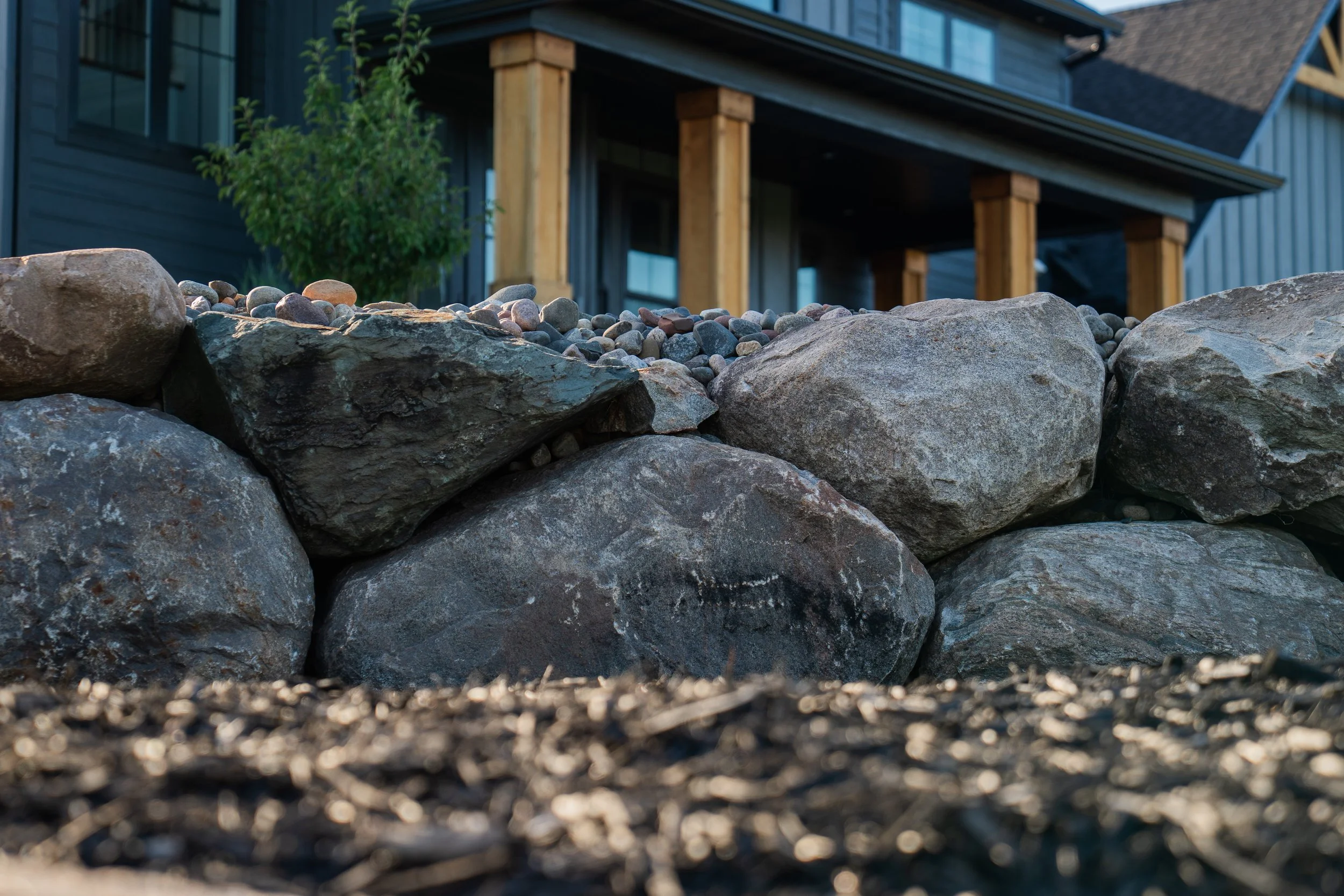 This property features expertly crafted tiered boulder retaining walls, built to provide lasting strength while complementing the natural surroundings. The large granite boulders not only stabilize the slope but also add texture, depth, and a timeless design element to the home’s exterior.